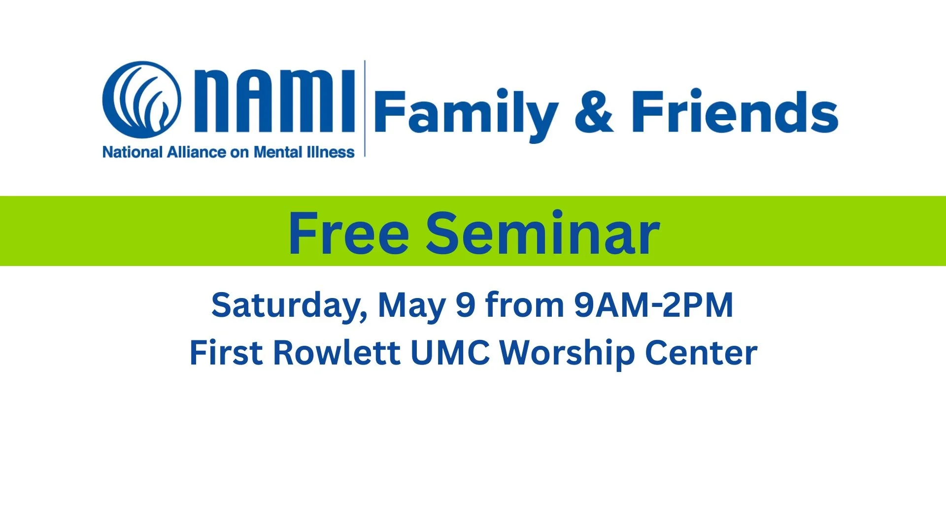 May is National Mental Health Awareness month, and we’re excited to partner with the National Alliance on Mental Illness to host a free Family and Friends Seminar. If you know, love, care for, support, work with, or advocate for someone living with mental illness, this is a great opportunity to learn skills and find support to be a better partner in their mental health journey. Whether you call First Rowlett your church home or not, we hope you’ll join us for this important event.