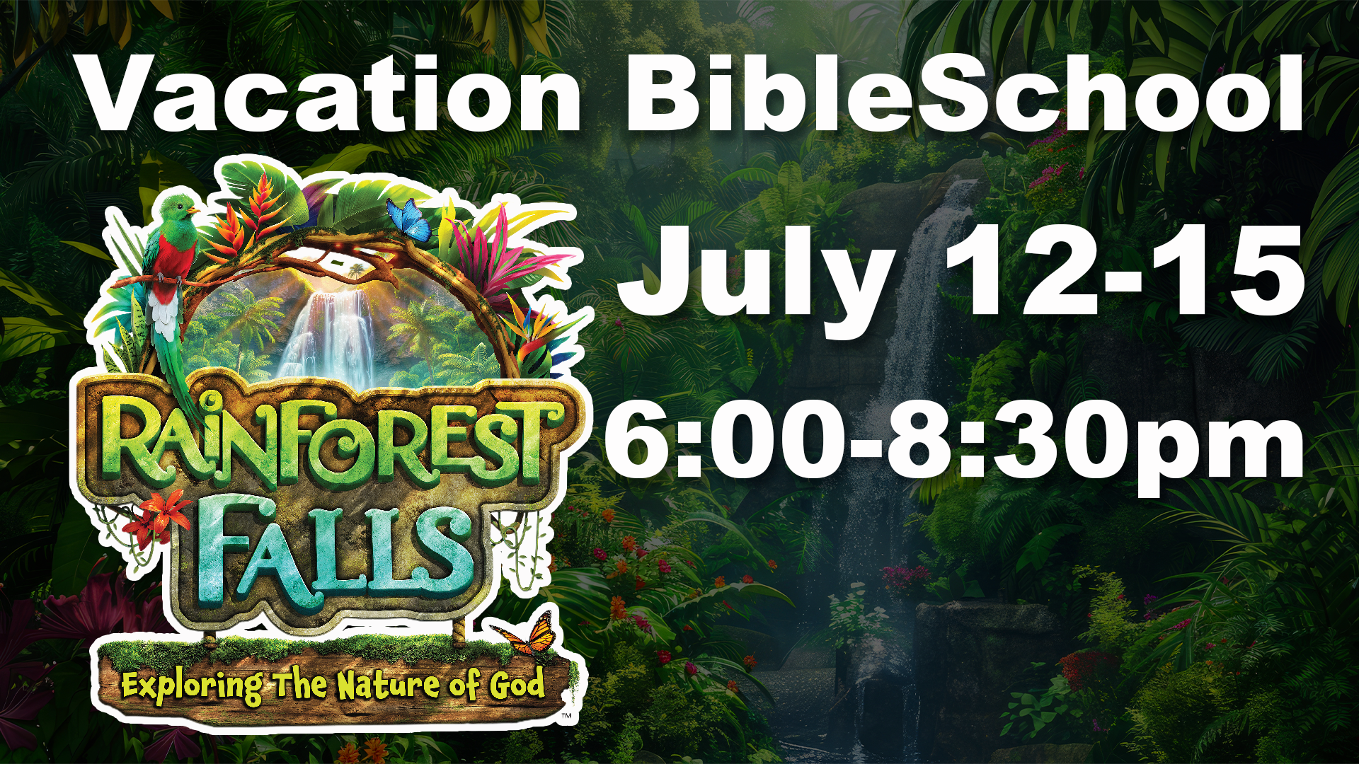 This year's Vacation Bible School will be July 12-15 from 6:00-8:30 pm. Step through the mist into Rainforest Falls, overflowing with wild waterfalls, towering trees and colorful creatures. Beneath a canopy of chattering birds and howling monkeys, kids plunge into a life-long adventure, discovering the nature of God, and exploring what it means to be rooted in relationship with their creator, a safe place in life's storms.